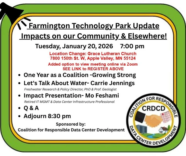 The Coalition for Responsible Data Center Development is a citizen-centered community committed to connecting Minnesota local and state leaders and organizations, property owners, and residents, working together to mitigate the impact of Data Center installations on electric grids, land use, conservation and water resources.