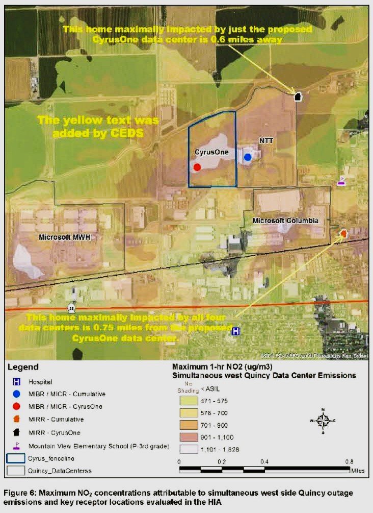 Some states, such as Washington, require a Health Impact Assessment (HIA) for the immediate vicinity of a proposed data center while many other states only assess health effects at the regional level. Figure 6 to the right is from an example of a local HIA, which was for the CyrusOne data center proposed for Quincy, Washington.