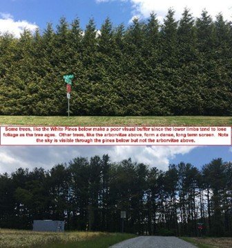 The trees should include at least a dense double row of evergreens that retain foliage year round from ground to tree top otherwise you may end up with a poor visual buffer like that shown in the lower photo on the left. Trees must attain a height sufficient to prevent visual impacts. In some cases it may be necessary to plants trees atop earth berms.
