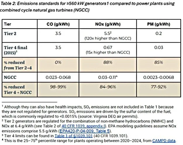 A better emerging data center air quality and human health solution is reliance on cleaner sources of backup emergency power such as combined cycle natural gas turbines with Selective Catalytic Reduction (SCR) emission controls as well as Battery Energy Storage Systems and renewables. Table 2, below, which was prepared by the Better Data Center Project, shows that while Tier-4 compliant generators release far less particulates and nitrogen oxides than Tier-2 models, reliance on combined cycle natural gas turbines as a backup power source along with Tier-4 compliant generators slashes both air pollutants to a far greater and healthful degree.