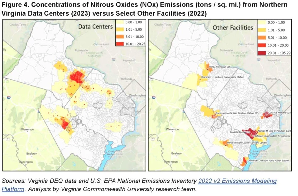 The map on the left side of Figure 4, above shows nitrous oxides (NOx) emissions, in tons per year, from Northern Virginia data centers by census block group. Each of the red dots in Figure 4 left is an individual data center. Emissions are highest (10.01 – 20.25 tons per year) where multiple data centers are located within the same or adjacent block groups. However, a single data center can elevate NOx throughout a block group covering a relatively large area. For example, the northernmost data center in Figure 4, is located in a block group where NOx emissions are 1.01 –5.00 tons per year. The data center is about 1.5 miles from the perimeter of this block group.