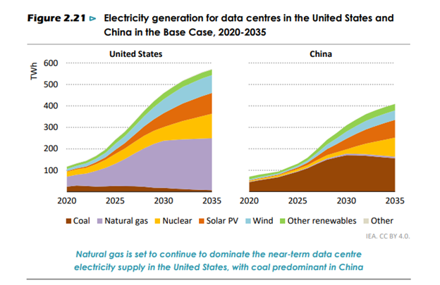 As noted in the nuclear energy section, Data Centers require enormous amounts of energy to run and cool their chips. According to the Union of Concerned Scientists, Figure 2 shows that in 2023, Data Centers used fossil fuels, including coal and gas, for approximately half of their energy needs. These come from both the electric grid demand and the backup diesel generators that Data Centers use before connecting to the grid and in the event of blackouts. These fossil fuels release carbon dioxide, nitrous oxide, and methane, all of which act as